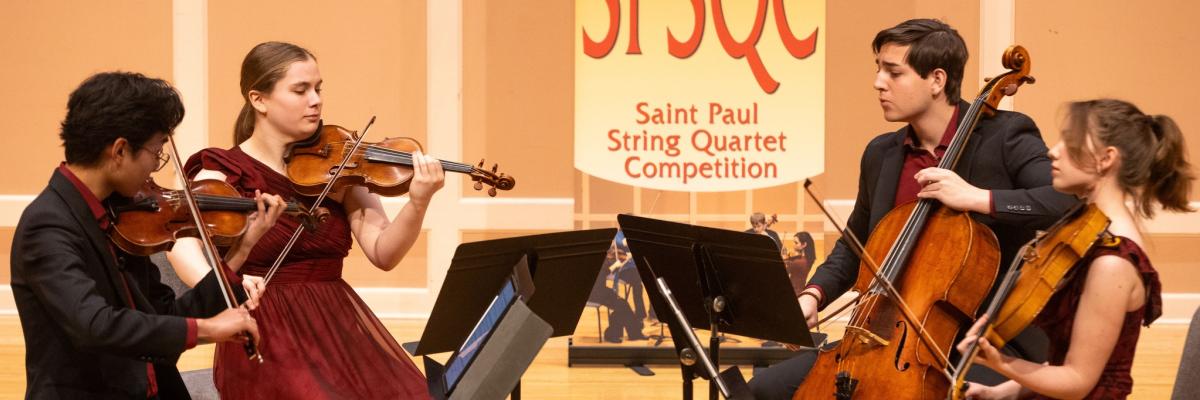 Porphyrion Quartet (Mingshi Xia, Sasha Varchenko, violins, Neena Agrawal, viola, and Simon Updegraff, cello, coached by Claudia Lasareff-Mironoff) and Caspian Quartet, (Lily Sullivan, Tristan Zhu, violins, Vivian Van de Sype Cucu, viola, and Jan Vargas Nedvetsky, cello, coached by Rodolfo Vieira) advanced to the 2025 Junior Division final round of the Saint Paul String Quartet Competition on Saturday, April 12. Established in 2006, this competition is nationally recognized for its role in identifying and supporting the finest pre-college and collegiate-level string players in the United States. https://www.spsqc.org/about