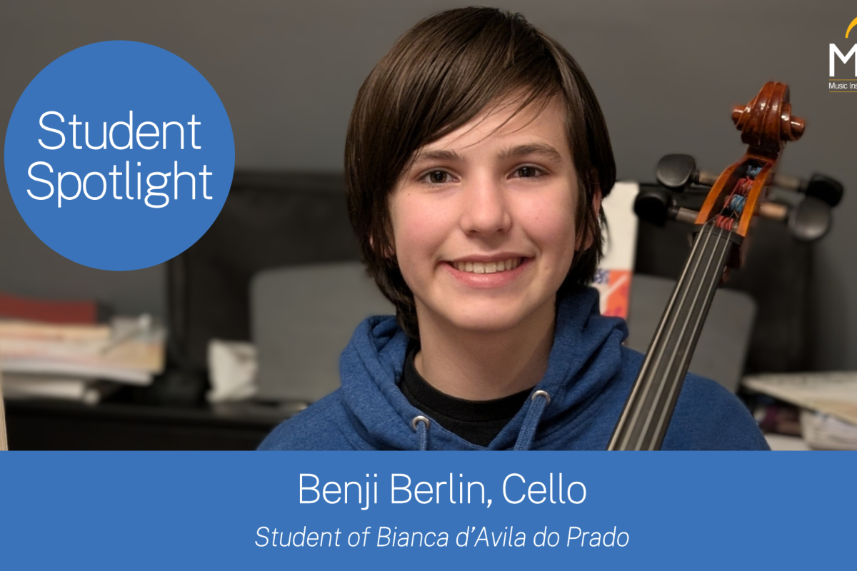 Fourteen-year-old Benji Berlin has been studying cello at the Music Institute of Chicago for two and a half years with his music teacher, Bianca d’Avila do Prado. Now in eighth grade at Wilmette Junior High School, he has developed a deep appreciation for music and the joy of learning his instrument.